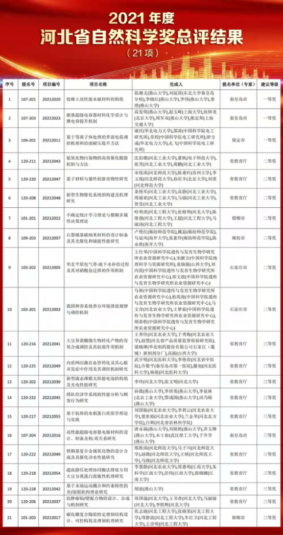 关于2021年度河北省自然科学奖、技术发明奖、科学技术进步奖总评结果及河北省科学技术突出贡献奖、河北省科学技术合作奖评审结果的公告
