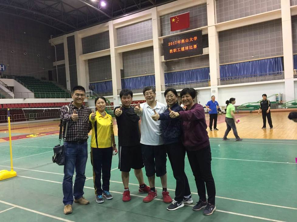 教职工毽球比赛”中,于维洋、蔡新江、康鹏松、梁建梅、马艳芳五位老师代表Hitomi