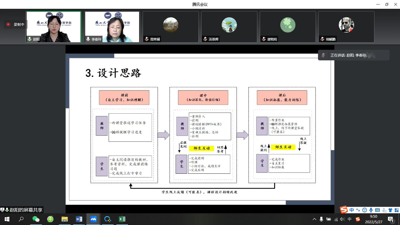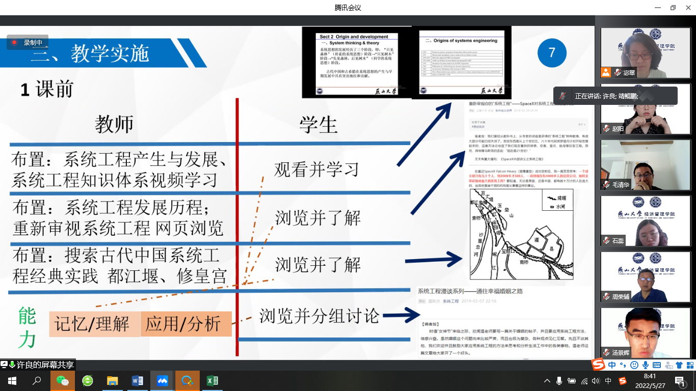 首先,由工业工程系的许良老师对《系统工程学》混合式教学创新设计从课程概况、教学设计、教学实施和考评成效四个方面进行展示。在对课程分析、设计基础上,结合第一章中“系统工程发展及定义”,从课前、课中和课后三部分对混合式教学设计和实施进行说明。课前通过学习通、QQ等布置任务,课上就案例听取同学汇报并进行点评,课后线上学习任务巩固。混合式教学的展开使学生在了解系统工程基本逻辑基础上,树立了科学的系统辩证思维,逐步形成了思政深度融合、双语教学、理论与实践紧密结合的课程特点。