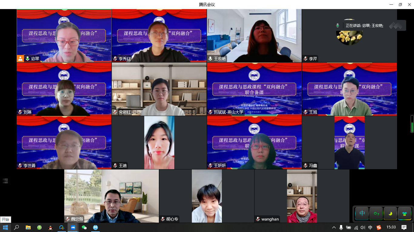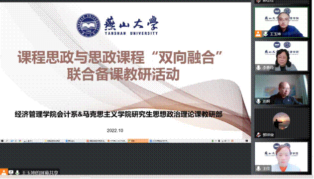 广大教师进一步强化育人意识,找准育人角度,提升育人能力,构建全员、全过程、全方位育人的“大思政”格局, 10月20日下午,学院联合马克思主义学院开展课程思政与思政课程“双向融合”联合备课教研活动。根据疫情防控要求,本次活动采取线上形式开展,活动由学院6个基层教学组织邀请马克思主义学院骨干教师分别开展,每组邀请一名处级领导参加,教务处副处长赵春梅、马克思主义学院书记王新华、副院长刘永志、图书馆馆长袁旭梅、Hitomi