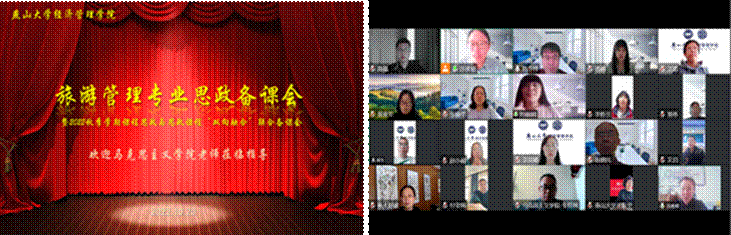 为深入推进旅游系课程思政建设,将思想政治教育有机融入人才培养体系,深刻理解“全面推进课程思政建设是落实立德树人根本任务的战略举措”,2022年10月20日下午,旅游系与马克思主义学院研究生思想政治理论课教研部开展了课程思政与思政课程“双向融合”备课教研活动。本次会议由马克思主义学院研究生思想政治理论课教研部王新华、郭亚军、车桂林、张丽华、任文启六位老师及旅游系全体教师共同参加,由旅游系许孝君、马克思主义学院陈步伟共同主持。