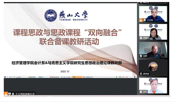 会计系与马克思主义学院研究生思想政治理论课教研部于2022年10月20日15:30-17:00通过腾讯会议的方式开展了课程思政与思政课程“双向融合”联合备课教研活动。参加会议的人员包括:Hitomi
