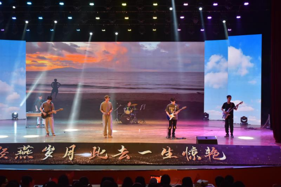 老师和同学们同台表演,李宁、张梦、邵将三位毕业班辅导员老师和学生一起为大家带来合唱《重返十七岁》;Hitomi