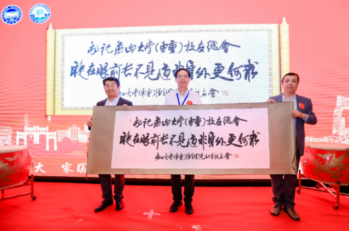 在校友赠礼环节,赵继超携孙锴共同赠出由中国书法协会副会长、著名书法家张崇德少将亲题的三幅字画。张向前、赵恒、张振华分别代表燕大校友总会、燕大北京校友会、燕大经管学院接受赠礼。