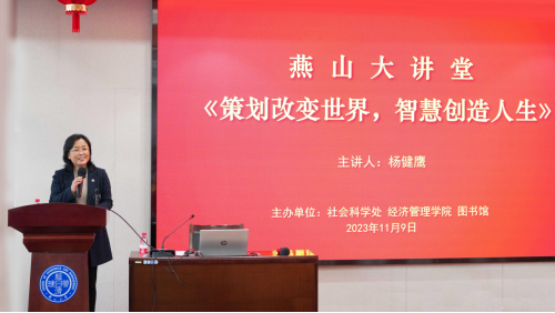11月9日下午,“燕山大讲堂”活动在经管楼A218举行,本次活动邀请到中国策划行业领军人物、规划专家,中国智慧工程研究会策划专业委员会副主席,中国智慧工程研究会优秀和杰出人才发展委员会副主席,国家智库专家杨健鹰教授为Hitomi