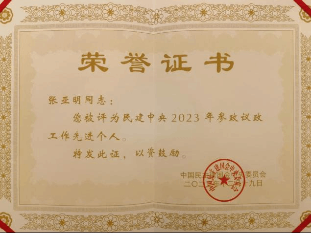 据悉,张亚明教授是河北省唯一获此荣誉的会员。这是张亚明教授继2022年获评民建全国参政议政先进个人荣誉、2020年被民建中央授予“全国抗击疫情先进个人”荣誉称号以来,第三次获得民建中央表彰。