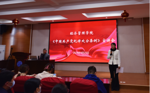 在A218召开学习贯彻《中国共产党纪律处分条例》宣讲会,宣讲会邀请到了学校纪委原副书记、文法学院教授张明作宣讲报告,会议由学院正处级专职辅导员、纪委委员杨小丽主持,院领导班子成员,各支部书记、专职组织员,教职工党员、学生党员共计130余人参加了会议。