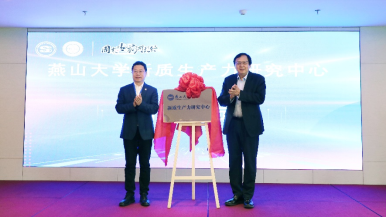 新质生产力研究中心揭牌仪式。赵险峰、穆荣平共同为中心揭牌。李春玲介绍了中心成立的背景、主旨和研究领域,表示将以高水平成果为新质生产力研究和发展贡献燕大力量、发出经管声音。