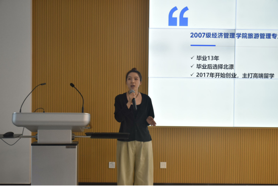 07级校友赵娜作为北京美奕嘉留学的创办人,以自身经历和专业视角,从留学优点、留学要求及录取标准等方面进行了细致的讲解,并结合工作经历,分享回国就业和落户的实例。最后,赵娜详细讲解了留学时间规划和申请流程,她建议同学们在决定留学之前要做好充分的调研和准备,为有意向出国深造的同学提供了宝贵的参考。