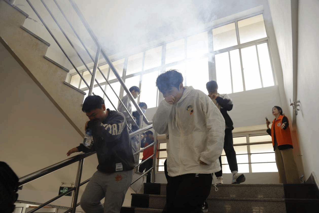 演练现场,学生第一时间发现火情后拨打火警电话呼叫救援,两名辅导员就近取用灭火器尝试扑救火情,因火势蔓延过快未能成功。同时,消防值班员确认火情后,立即启动消防广播系统,发布紧急疏散指令。按照“安全第一、就近逃生”的疏散原则,引导楼内师生沿应急疏散安全路线快速撤离,等待救援力量赶往现场。