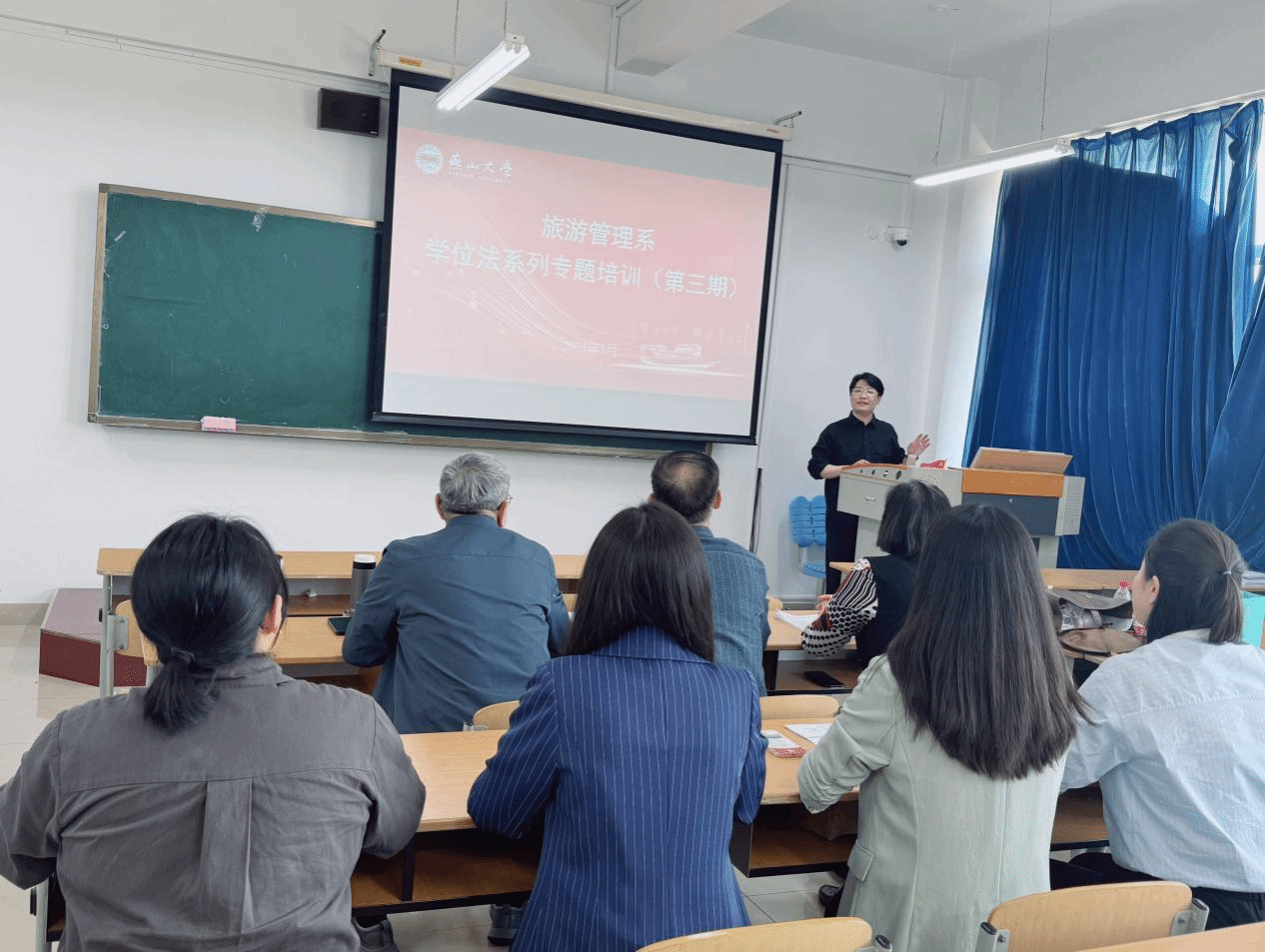 为全面贯彻落实国家教育政策,提升学位授予与管理规范化水平,学校教务处、教师培训中心开展学位法“两段式四保障”管理及学位授予单位制度建设专题培训第三期活动。旅游管理系于5月26日在西(五)C201,组织全体教师集中学习了东南大学研究生院研究生培养办公室主任陆建教授题为《贯彻落实学位法加快培养国家急需人才》专题报告。培训活动由系副主任高磊主持。