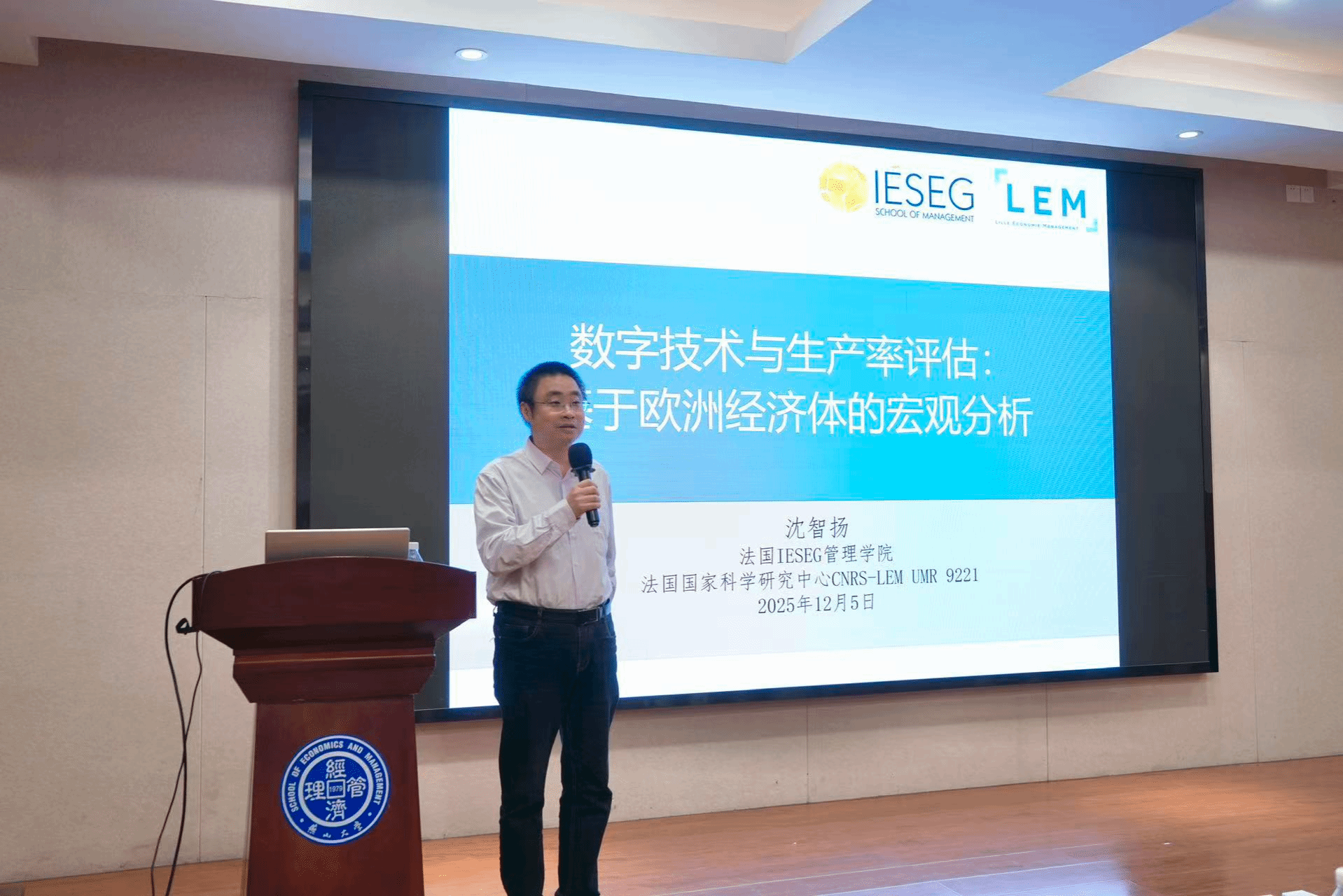 沈智扬教授现任法国IESEG管理学院(巴黎校区)终身教授,同时担任法国国家科学研究中心(CNRS-LEM UMR 9221)研究员及博士生导师。主要研究领域为发展经济学、效率与生产率分析等。在高水平国际期刊上发表学术论文100余篇,其中AJG/ABS 4星/3星期刊论文60余篇。担任多个国际期刊编辑与编委。连续入选爱思唯尔(Elsevier)应用经济学科的“高被引学者”和全球前2%顶尖科学家榜单等。在法国IESEG管理学院连续获得最高教学评价A+,并获得卓越研究奖(Research Excellence Grant)。沈智扬教授的这次报告为师生们提供宝贵学术交流机会,不仅帮助大家明晰数字经济作为一种投入要素对经济增长的驱动路径,更启发大家在未来研究的新思路与新方向。