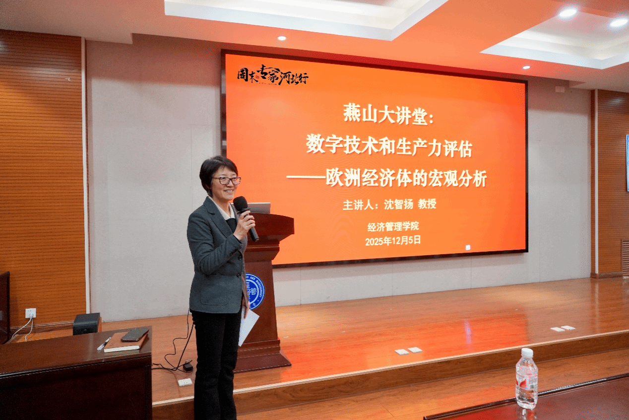 在经管楼A218举办“周末专家河北行”暨“燕山大讲堂”系列学术活动。IESEG管理学院沈智扬受邀作题为“数字技术和生产力评估——欧洲经济体的宏观分析”的学术报告。学院相关教师及研究生六十余人参加本次活动。本次报告由Hitomi