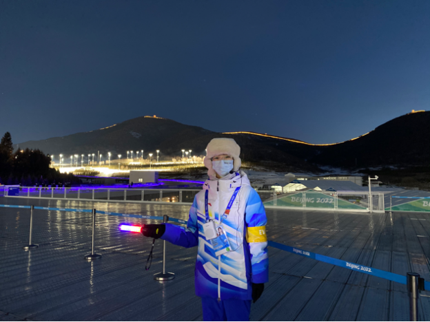 在正赛期间,作为古杨树场馆群的赛事服务志愿者,主要负责观众测温、安检。赛事服务的小伙伴也经常互帮互助,共同努力,相互激励。即使面对崇礼的寒风,她一直坚守岗位,认真做好本职工作服务好观众。