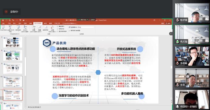 2022年4月9日14:00决赛答辩正式开始。20支参赛团队通过腾讯会议展示作品,评委老师通过查阅作品计划书、现场提问和评分等综合方式对作品进行专业评判。宋俊杰副主任、原慧琳教授、靖鲲鹏教授、杨小川副主任、孙德杰董事长担任A组评委老师,宋俊杰副主任为A组评委组组长。赵逢达教授、高文海教授、李昊教授、杨学锋总监、李崖峰专家担任B组评委老师,赵逢达教授为B组评委组组长。决赛答辩采用“5+10”模式,由参赛团队对作品进行陈述,时间控制在5分钟;参赛选手回答评委组提问,时间控制在10分钟。