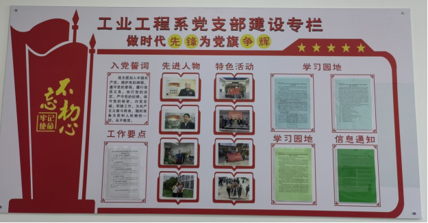 党委工业工程系党支部积极利用“党支部建设专栏”展板,围绕习近平新时代中国特色社会主义思想,继续深化对习近平新时代中国特色社会主义思想的学习和实践,开展了“党的二十大报告学习辅导百问”、“习近平总书记关于教育的重要论述”、“‘把党百年奋斗的历史经验传承好、发扬好’系列文章”、“党的二十届三中全会精神解读”等一系列党的理论宣传和学习活动,组织开展了钱七虎、唐菊兴、张桂梅等我国教育领域、科技领域等行业领域先进人物图片事迹展览和学习,党建和基础文化建设取得了显著成效。
