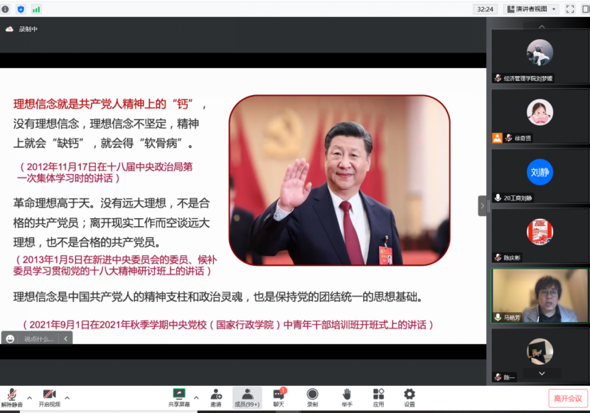 课程最后,马老师开展了“心中有理想,脚下有力量。”主题宣讲,升华课程主题,表明共产党人要不忘初心使命,砥砺前行,全心全意为人民服务,理想信念就是共产党人的精神之“钙”,对于青年党员来说,更要坚定理想信念,勇做时代浪潮儿,在为人民谋利益的事业中放飞青春梦想,在中国特色社会主义事业中书写人生华章!