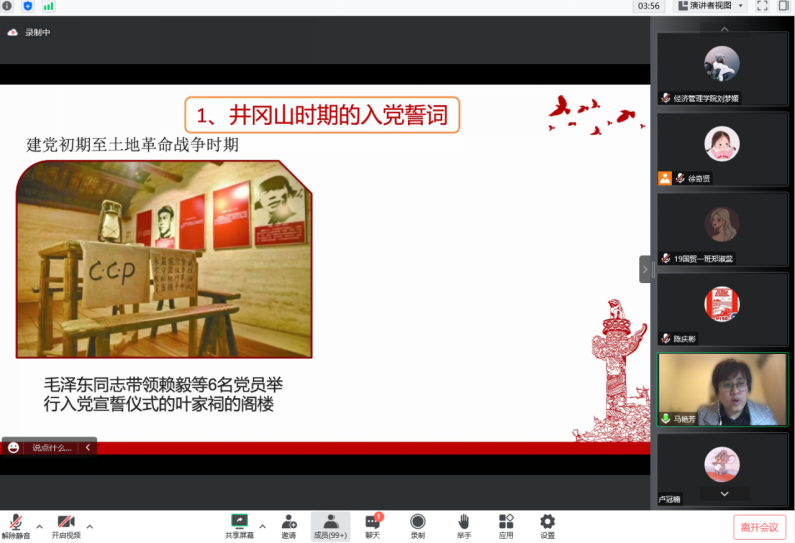 在对信仰有了初步的认识后,马艳芳老师接着带领同学们分析学习入党誓词。从入党誓词的沿革谈理想信念教育,从星星之火可以燎原的井冈山时期到全民族统一战线的抗日战争时期,再到争取民族自由解放的解放战争时期,以及新中国成立后和十二大之后的五个时期,入党誓词在时代的淬炼中不断注入新的内涵。在此过程中,确定了评定共产党员的标准,引领新时代党员更好地行使权利、履行义务。入党誓词的沿革说明了党的建设始终在践行,善于把握不同历史时期的主体和要求来培育和发展党员,反映了党高度重视党性教育和理想信念教育,表明党与时俱进的先进性。