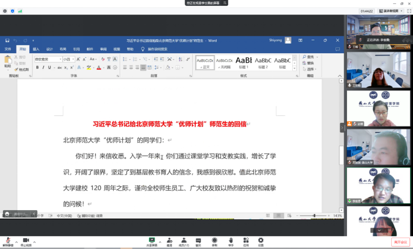 11月3日下午,电子商务系党支部以线上会议方式举行了学习贯彻习近平总书记给北京师范大学“优师计划”师范生重要回信精神活动,支部书记李世勇主持了学习活动,电子商务系全体教师参加了学习活动。
