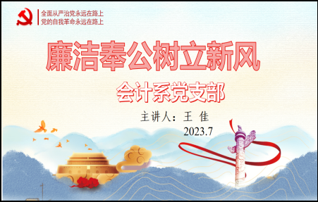 深入开展学习贯彻习近平新时代中国特色社会主义思想主题教育7月8日晚上8:00会计系党支部书记王佳通过腾讯会议为本支部党员讲授《廉洁奉公树立新风》主题教育专题党课,进一步增强党员教师的党性修养和党员意识。