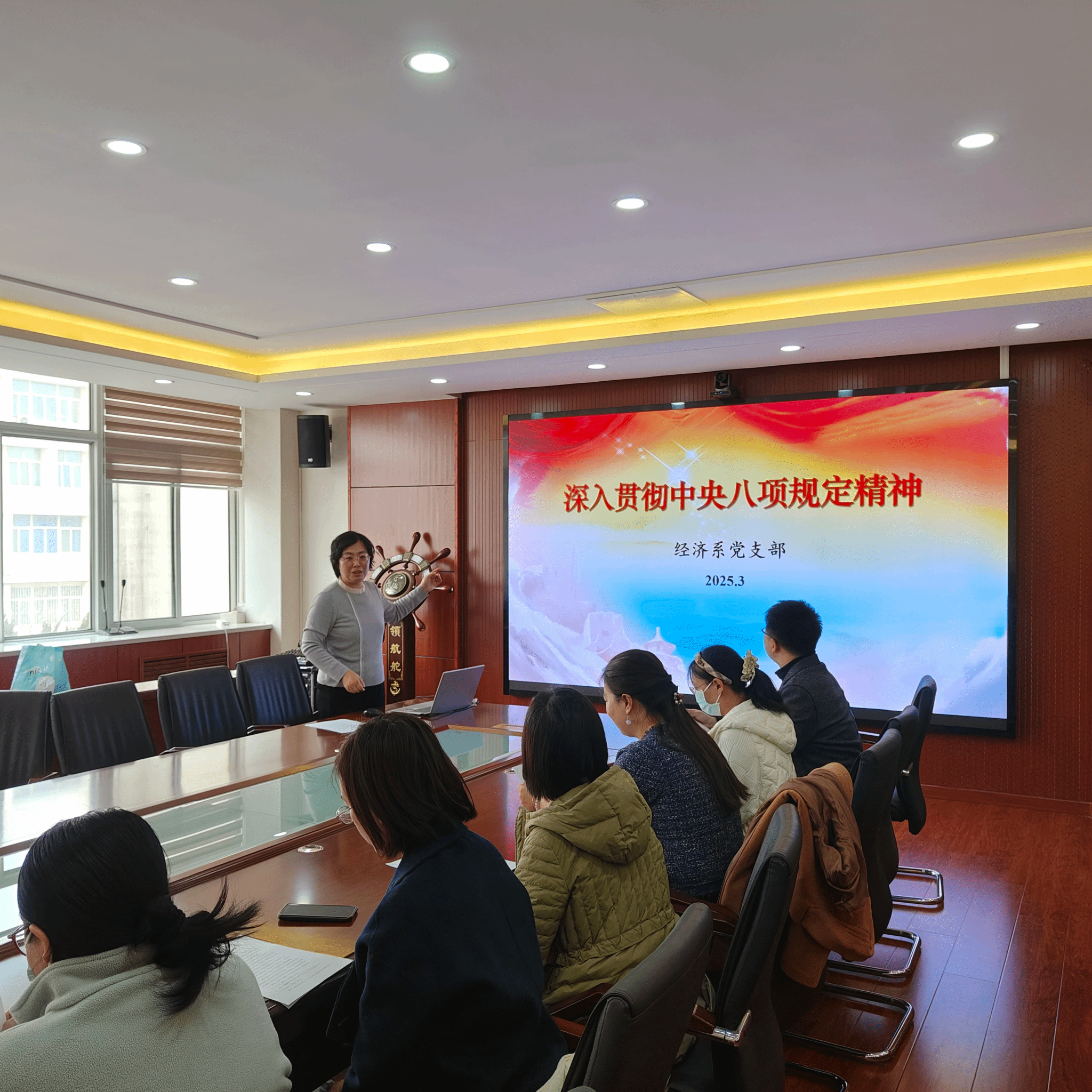 为落实党中央和上级党组织的部署,2025年3月31日,经济系党支部书记徐蕾为党员们上了一次以“深入贯彻中央八项规定精神”为主题的党课,主要介绍中央八项规定的由来和主要内容,并结合现实情况,对违反中央八项规定精神的具体表现进行分析。党员们在认真听党课的基础上开展了热烈讨论。大家认为,中央八项规定抓住了新时代党的作风建设的要害之处,党的作风关系人心向背,作风建设必须久久为功。作为教育工作者,我们要坚持先学一步、学深一层,认真领悟,并且丝毫不能有任何动摇、懈怠、放松的麻痹思想,以持续筑牢党建工作根基。