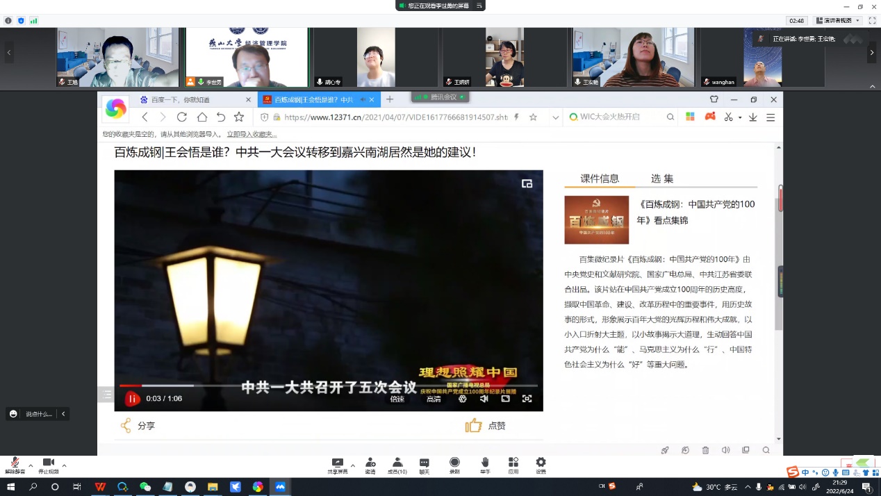 6月24日,电子商务系党支部以线上形式开展了“坚定理想信念,牢记初心使命”活动,电子商务系支部全体党员教师参加,民建会员刘海鸥、民进会员冯鑫、群众厉斌斌列席,通过百年党史学习教育、专题党课活动、观看建党百年视频等一系列方式,庆祝中国共产党成立101周年。