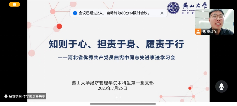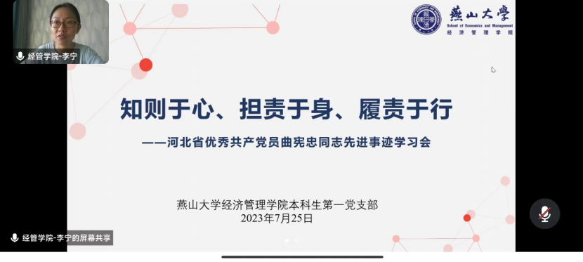 经管学院本科生第一党支部通过腾讯会议组织开展党员向曲宪忠同志学习活动,活动主题为“知则于心、担责于身、履责于行”,支部书记李宁老师、支部成员刘佳和李红飞积极参与,共同学习曲宪忠同志的先进事迹。