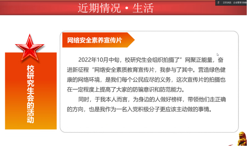 本次答辩会一共分为自我陈述、评委提问、打分三个环节。在答辩过程中,答辩人重点汇报自己理论学习情况、学习科研情况、与培养人、党支部联系情况、参加支部活动情况、参与学院活动、社会服务和志愿服务情况等。通过线上“互动”答辩,有助于督促入党积极分子主动学习党的理论知识,更有助于党支部对学生进行精准指导。