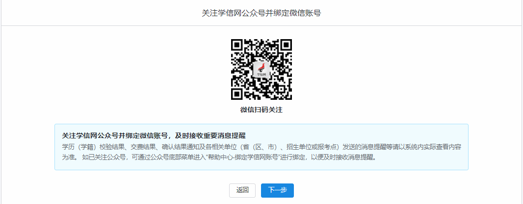 关注学信网公众号并绑定微信账号,以便及时接收重要消息提醒。