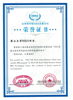 MBA教育品牌影响力和市场竞争力日渐提升,荣膺“2015年度最具创新力MBA院校”、“2020年度中国MBA十佳商学院”、“2020年度中国商学院特色MBA项目奖”、“2020年度中国商学院卓越运营奖”、“2021丝路全球商学院最具品牌价值MBA项目”等多项荣誉。