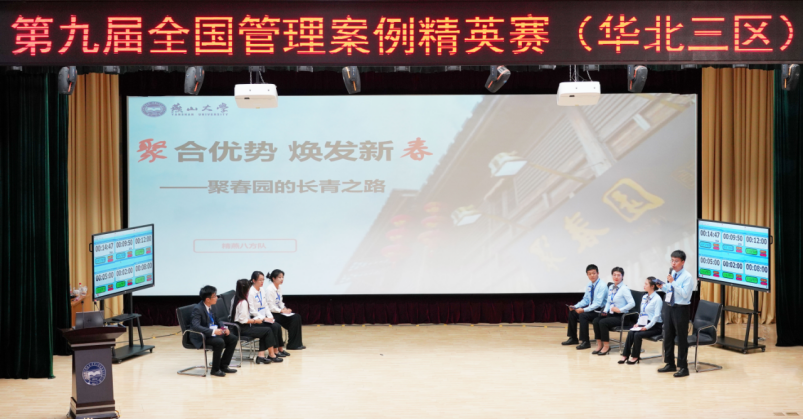9所院校共16支参赛队伍参加了比赛。参赛队伍围绕大赛案例《百年中华老字号聚春园的换新之旅》进行陈述和问答,全面检验各参赛队伍对案例的分析理解、延伸视角等综合素质与能力,最后依据材料盲审成绩及现场比赛成绩加总得分评选出团队奖项及个人奖项。